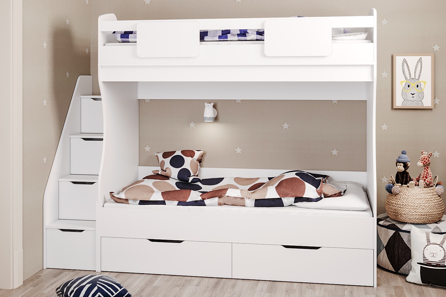 Кровать имеет также два выдвижных ящика для хранения белья или игрушек с доводчиками.
