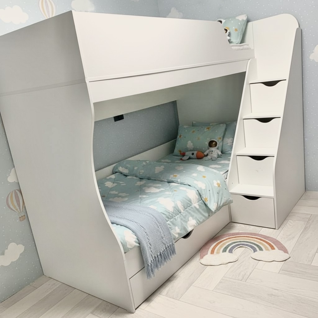 Высокая нагрузка на спальные места. Удобная лестница с ящиками. Высокий, безопасный бортик |