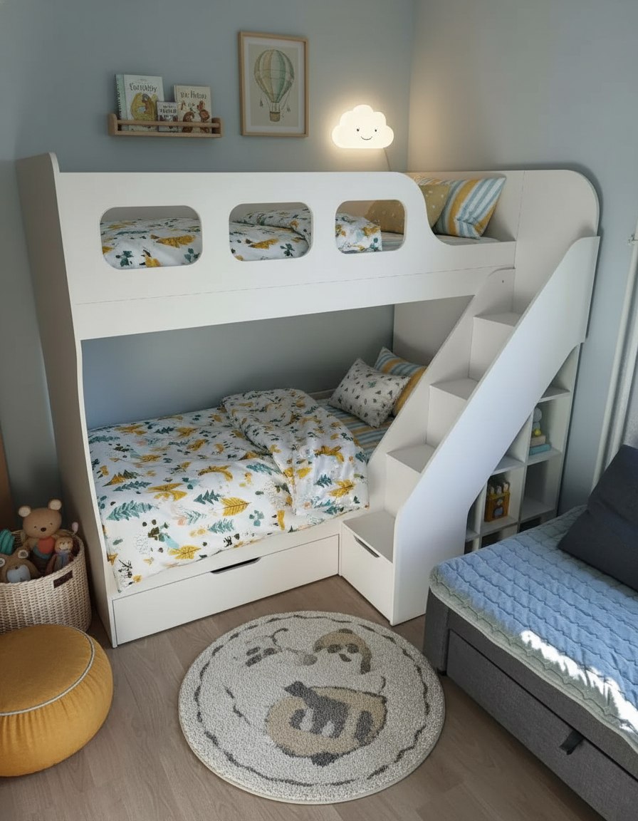 Удобная, безопасная лестница со встроенными полочками для книг и игрушек и комфортная высота кровати.