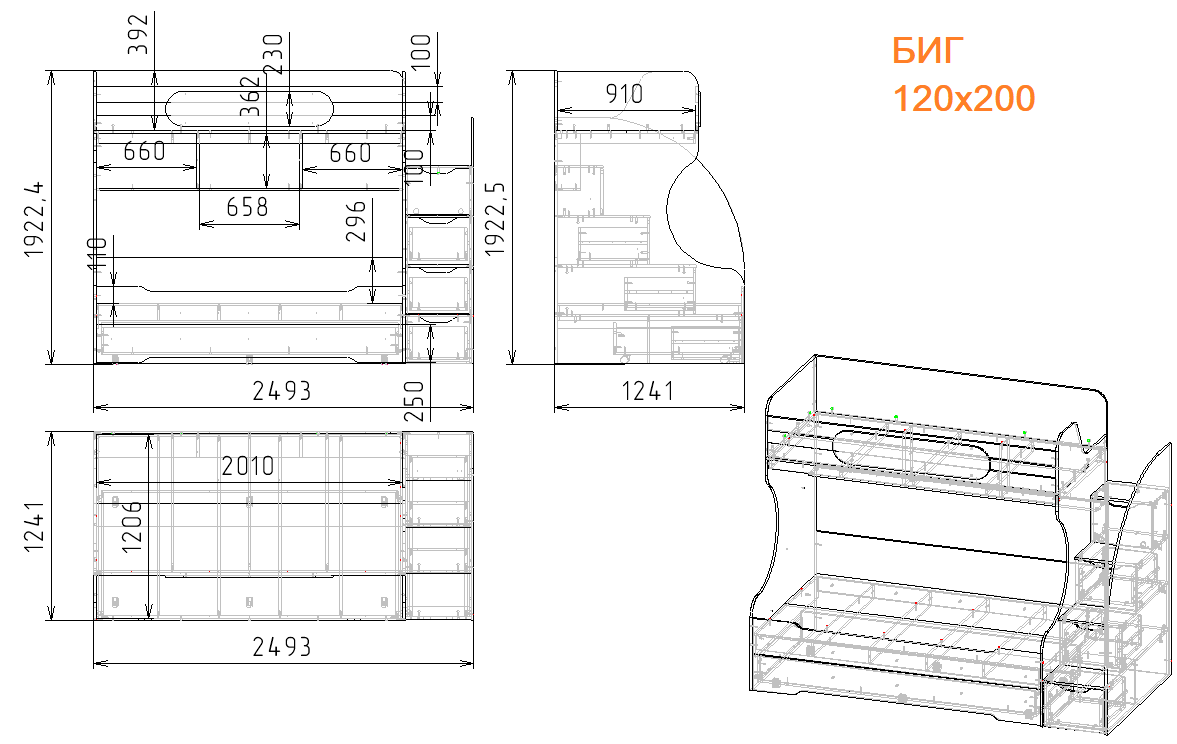 Габариты кровати: ширина вместе с лестницей 2493, глубина 1241, высота 1922 мм