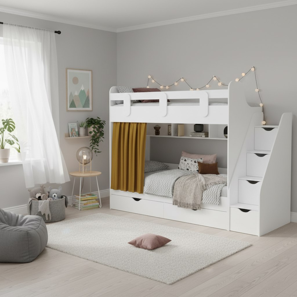 Выдвижные ящики в нижней кровати изготовлены с применением метабоксов, что делает изделие практичным и надежным.