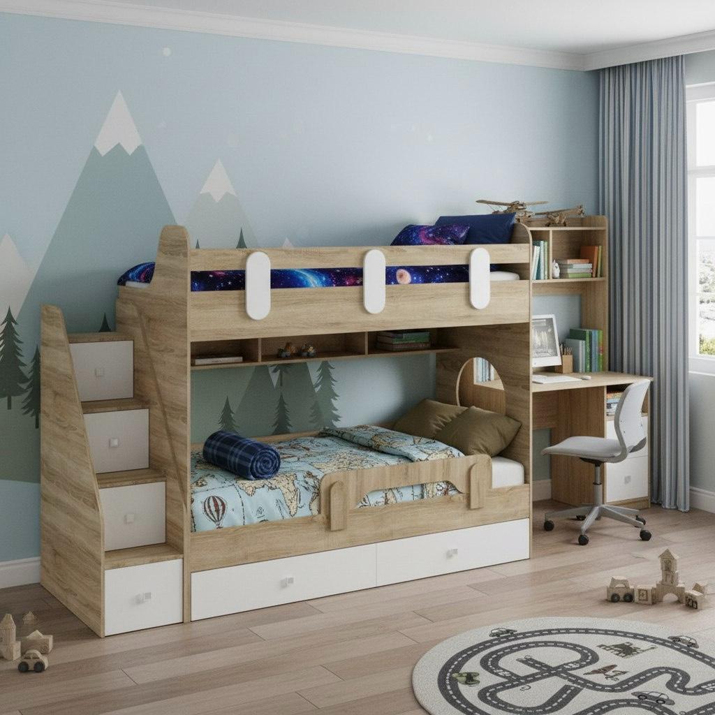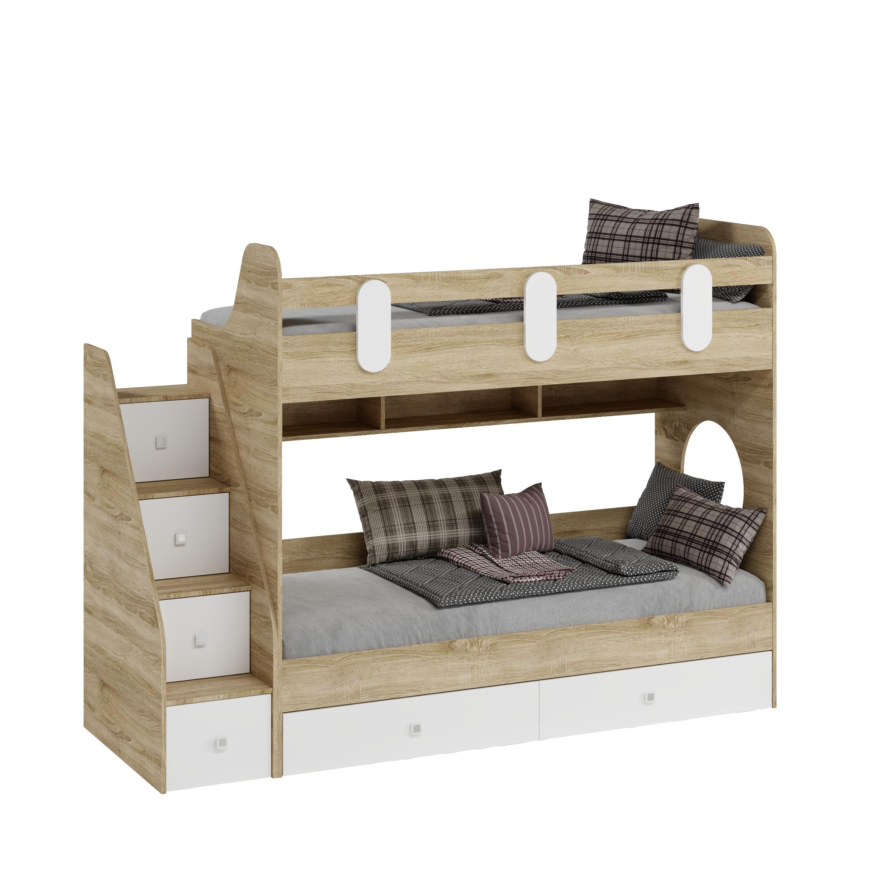 Выдвижные ящики в нижней кровати имеют глубину 450 мм, высоту 150 мм