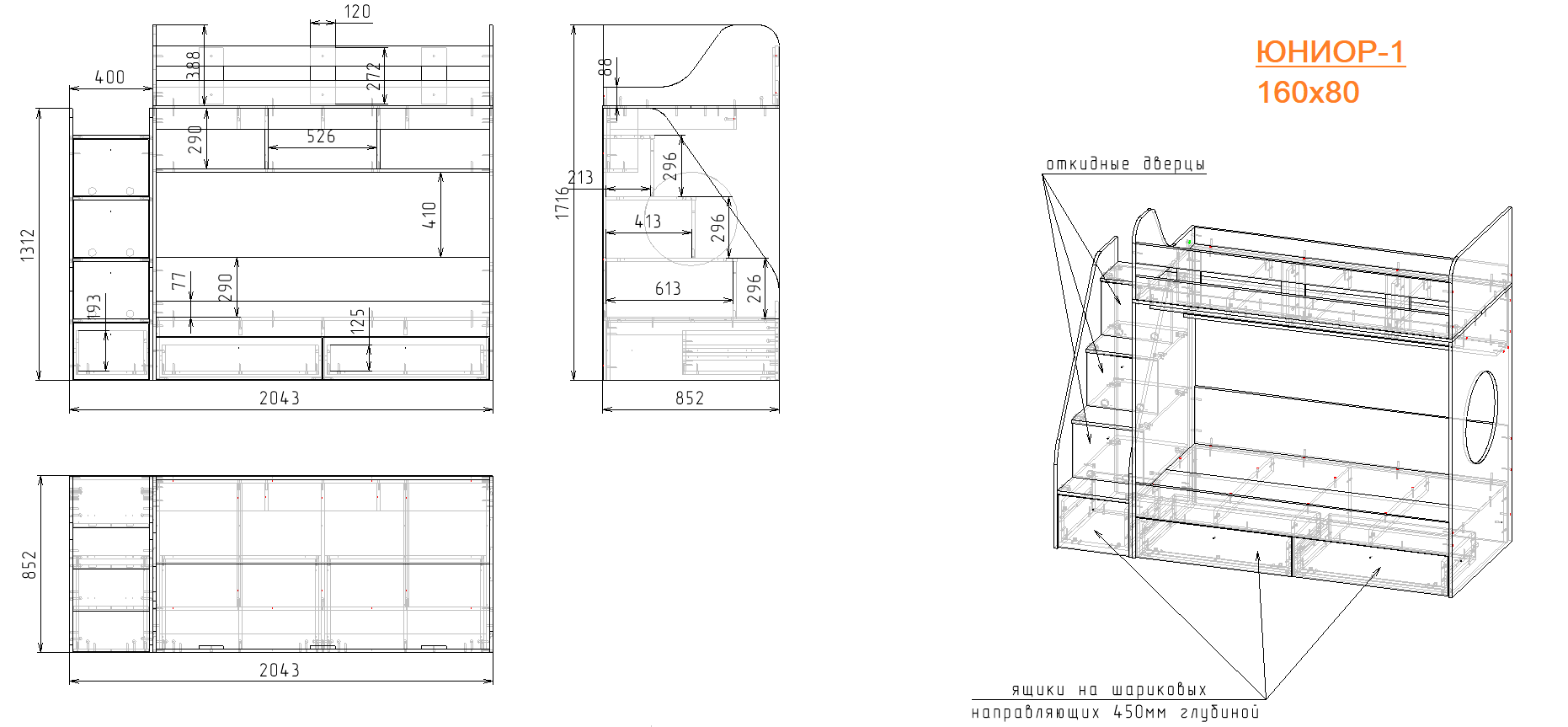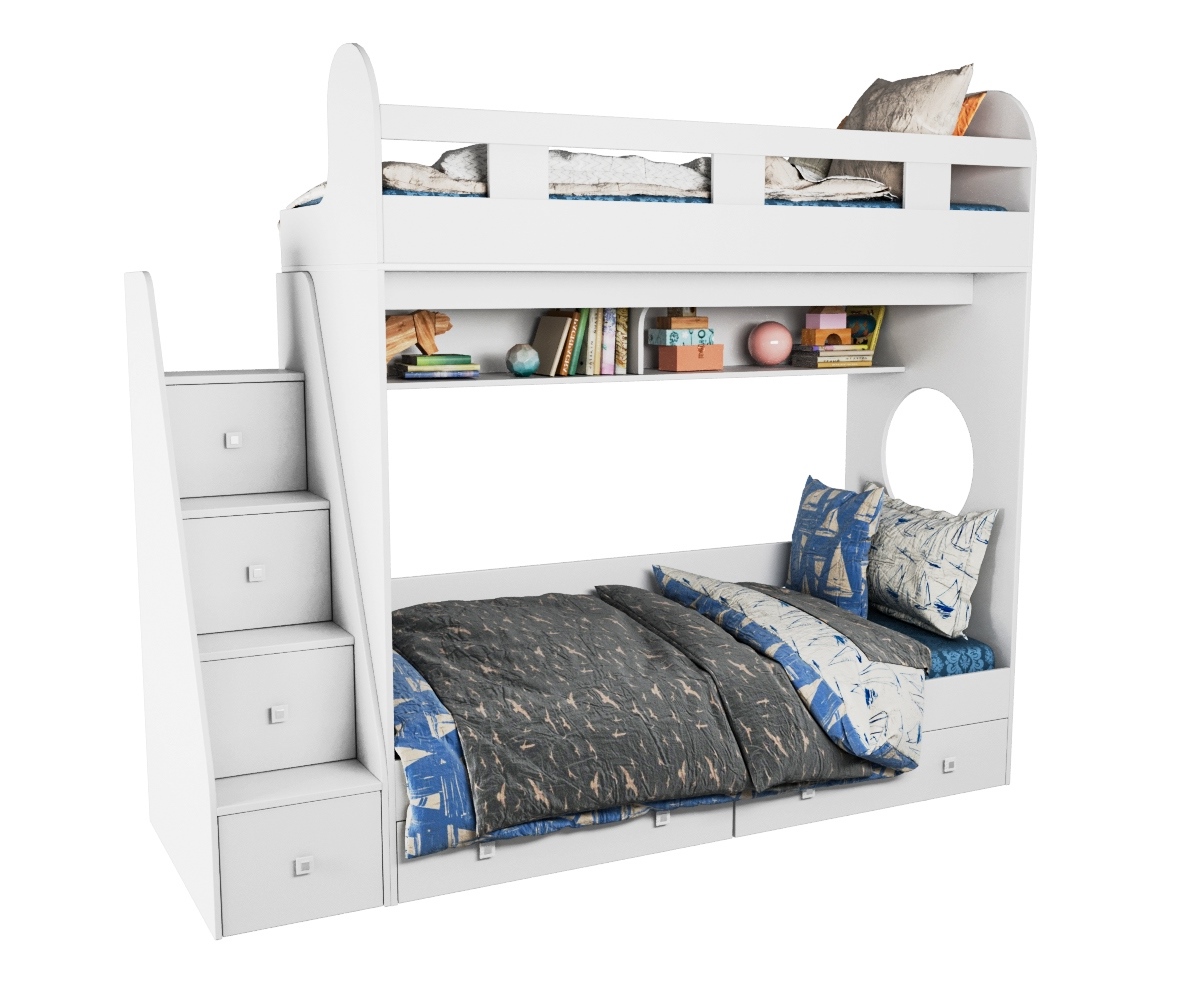 спальное место для двоих, навесная полка для книг и игрушек, вместительные выдвижные ящики под кроватью, а также безопасная лестница, обеспечивающая быстрый и удобный доступ на второй этаж.