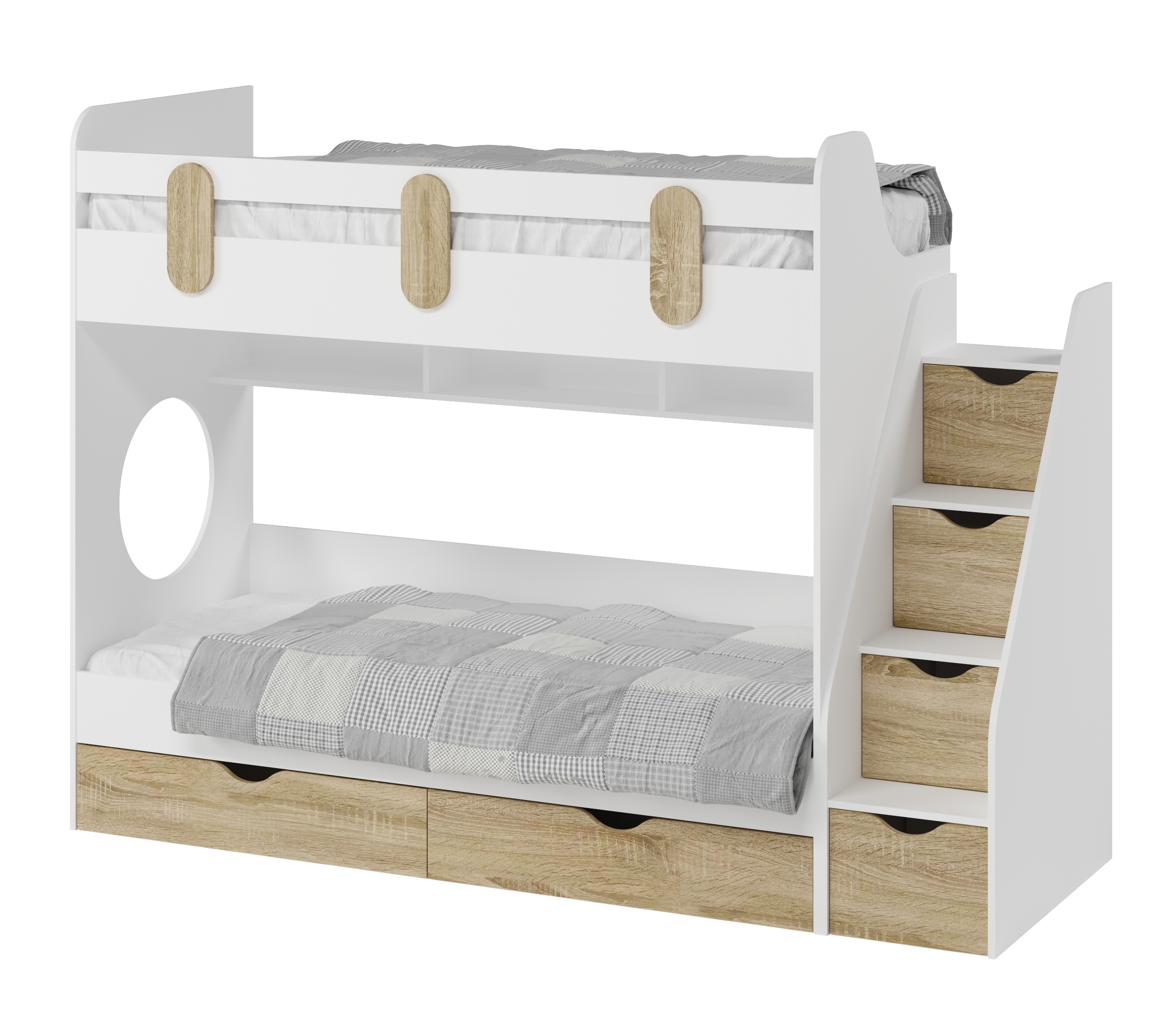 Выдвижные ящики в нижней кровати изготовлены с применением метабоксов, что делает изделие практичным и надежным.