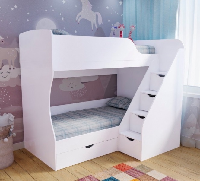 Преимущества данной модели - удобная, безопасная лестница с ящиками для игрушек и комфортная высота кровати.