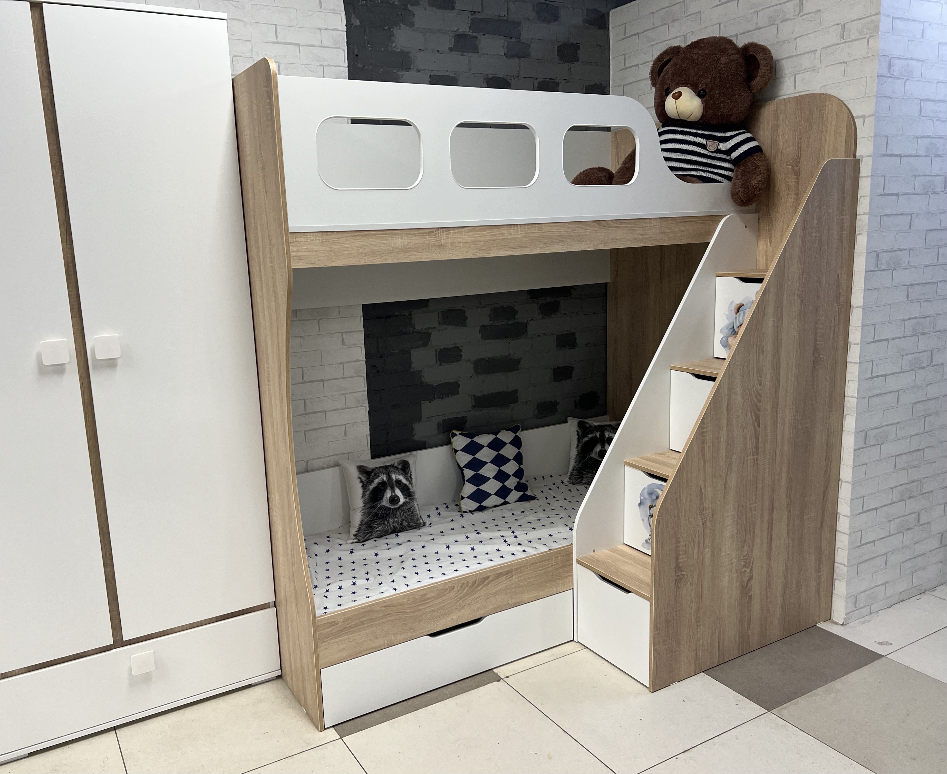 Высокая нагрузка на спальные места. Удобная лестница с ящиками |