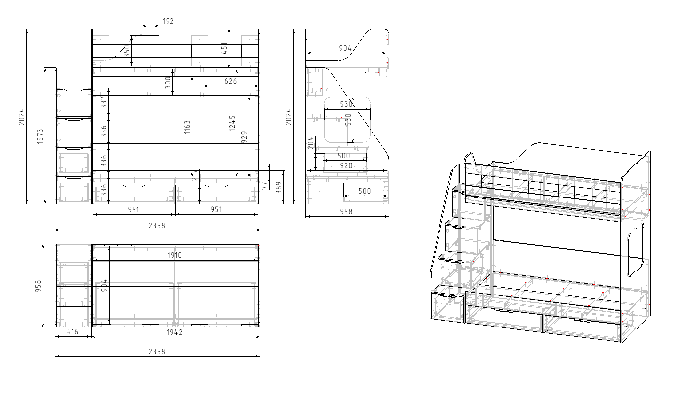 спальное место для двоих, навесная полка для книг и игрушек, вместительные выдвижные ящики под кроватью, а также безопасная лестница расположенная сбоку, обеспечивающая быстрый и удобный доступ на второй этаж, с безопасными ступенями в виде выдвижных ящиков.