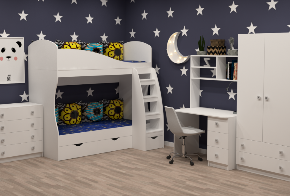 кровать 2-х ярусная + стол + шкаф + комод
