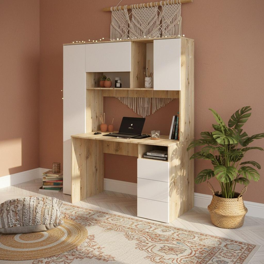 Просторная поверхность, удобные полки и ящики позволят разместить учебники, книги и канцелярию.
