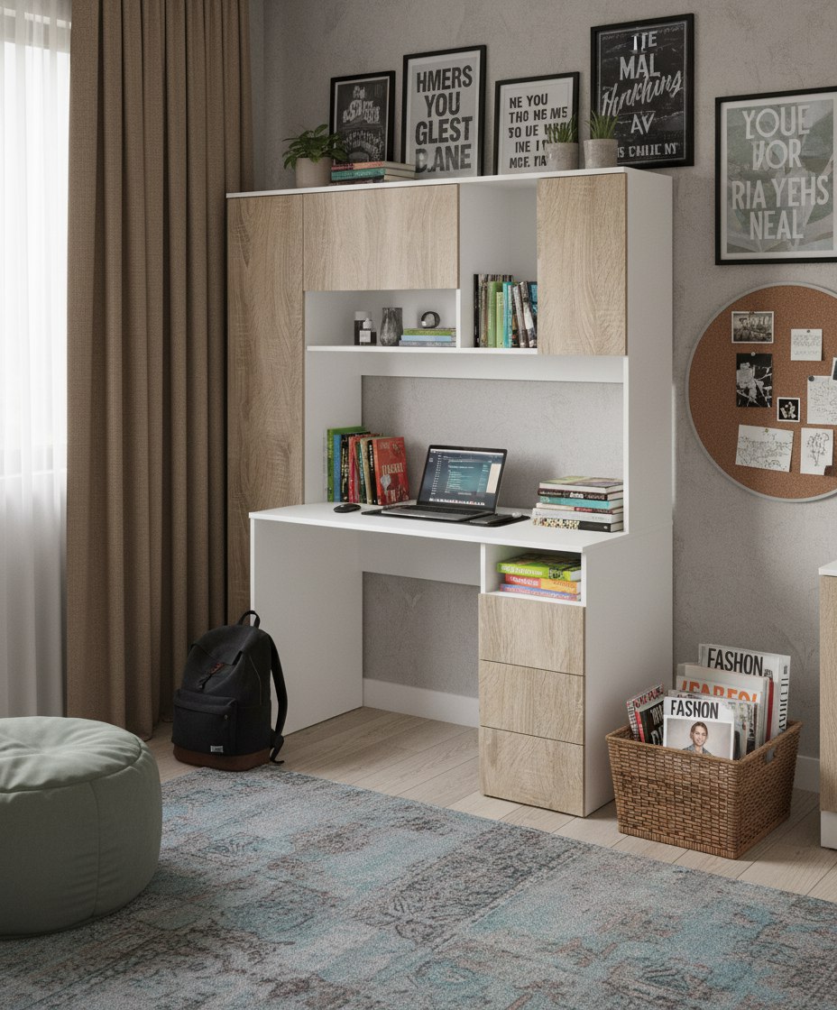 Просторная поверхность, удобные полки и ящики позволят разместить учебники, книги и канцелярию.