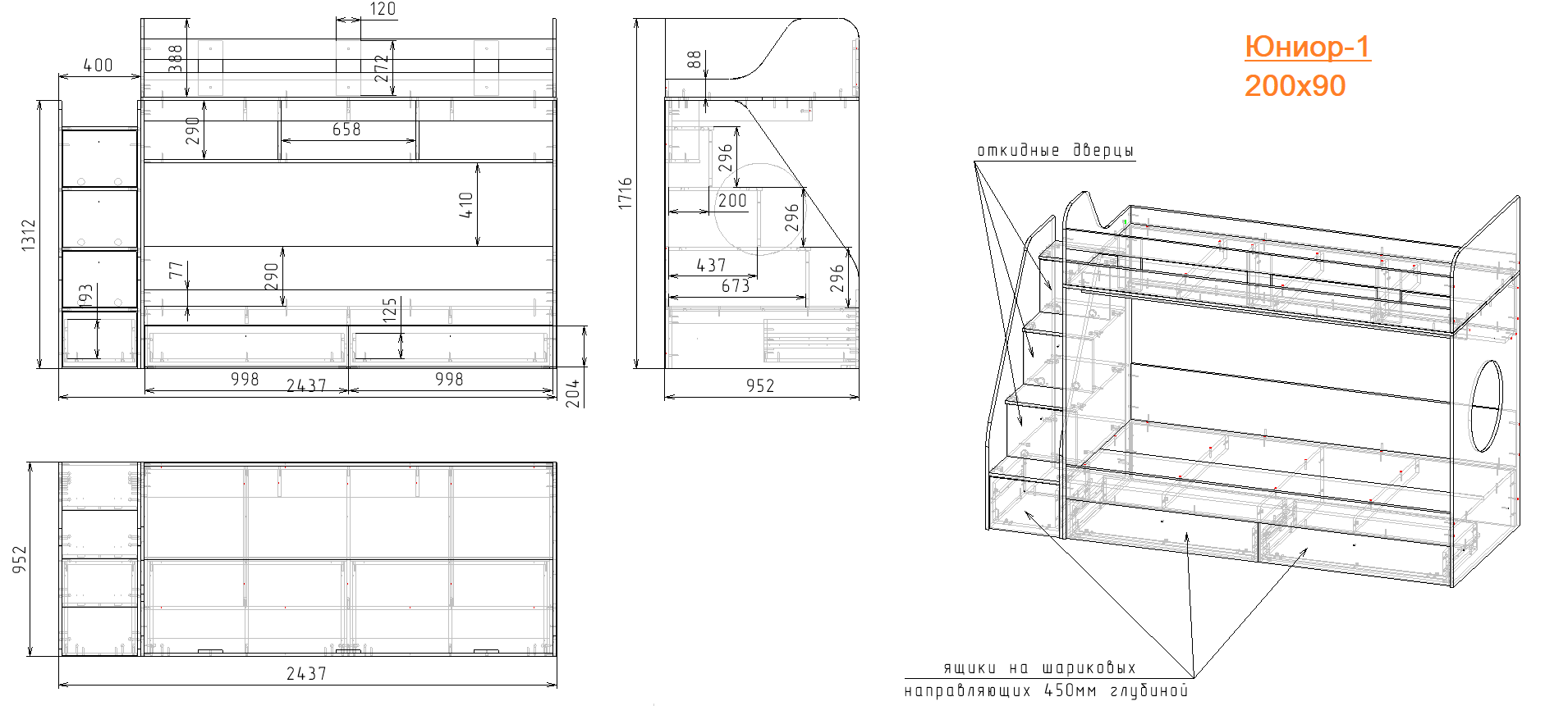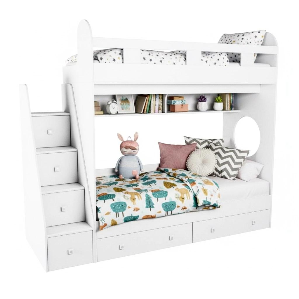 спальное место для двоих, навесная полка для книг и игрушек, вместительные выдвижные ящики под кроватью, а также безопасная лестница, обеспечивающая быстрый и удобный доступ на второй этаж.