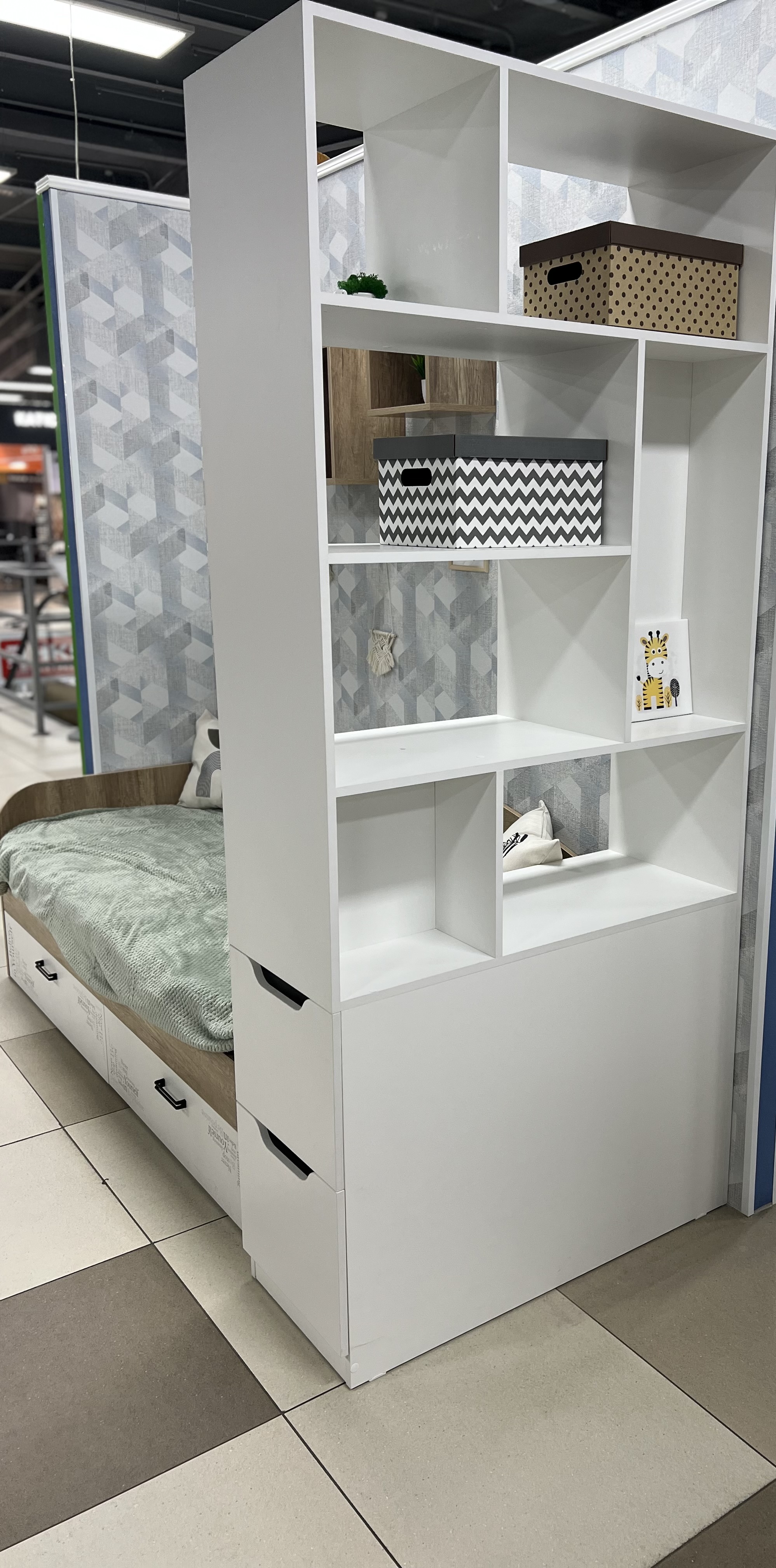 <comment>Просто шикарный стеллаж для создания зонирования! Подкупили сразу вместительные выдвижные ящики. Очень функционально. Кровать тоже отличная! Спасибо вам </comment>