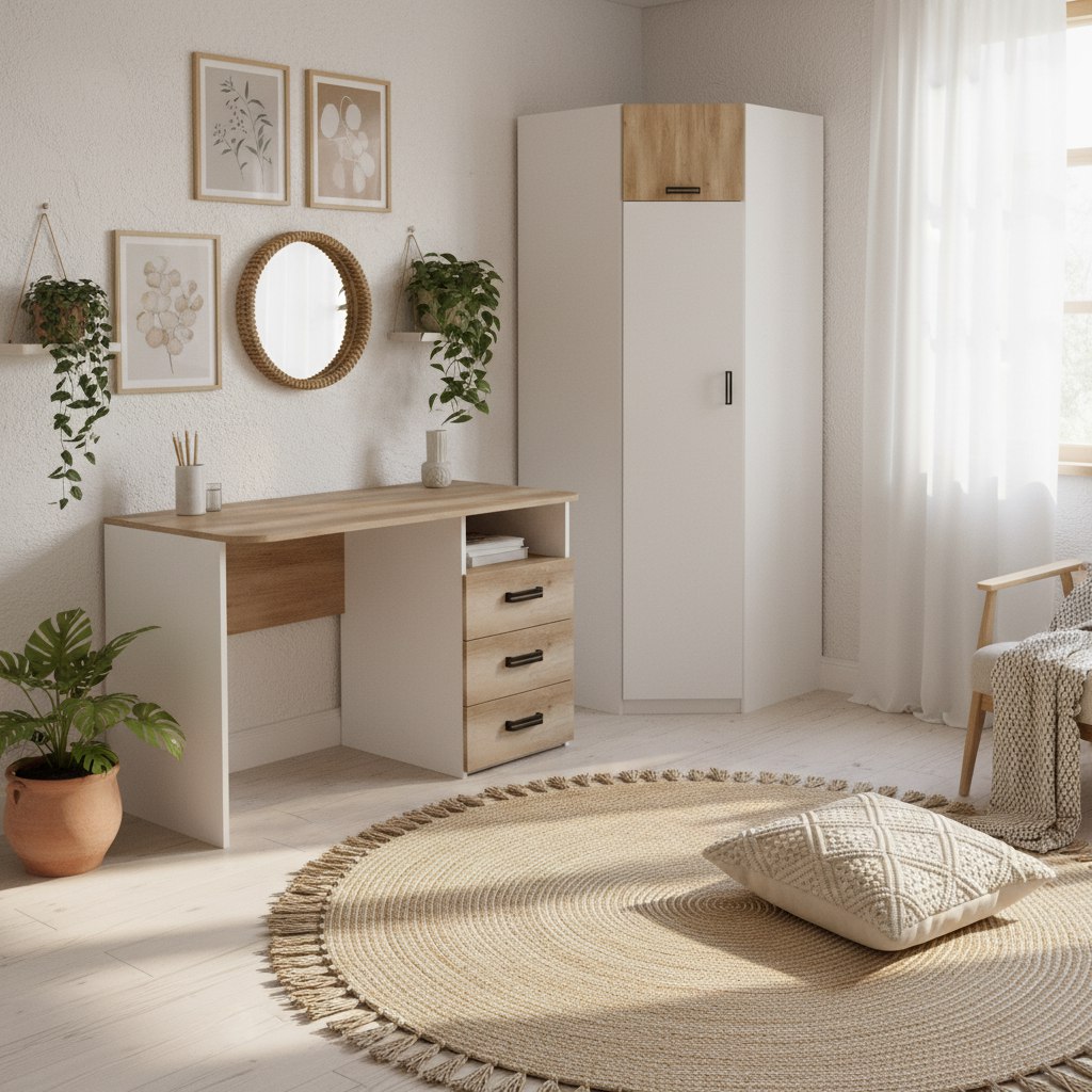 Мебель выполнена из качественного, экологически чистого ЛДСП класса Е0,5 в цветах дуб каньон + белый.