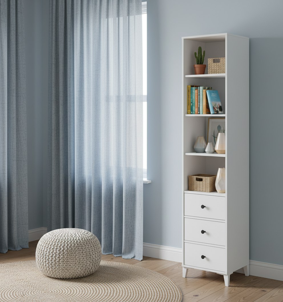 В пенал встроены три выдвижных ящика на направляющих скрытого монтажа с доводчиками.