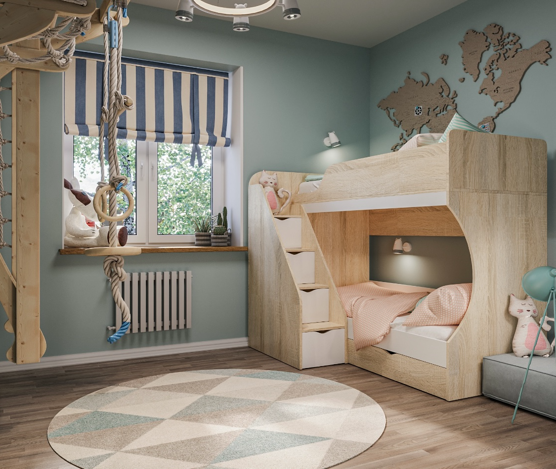 В нижнюю кровать встроен выдвижной ящик для белья и игрушек.