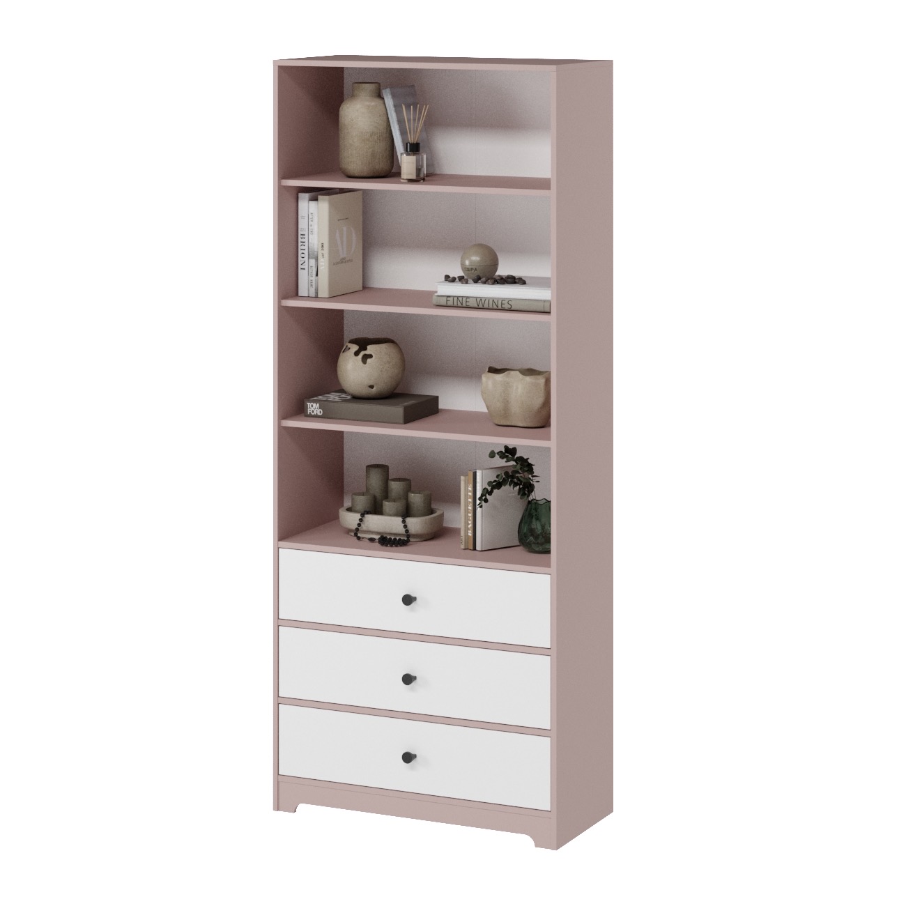 В стеллаж встроены три выдвижных ящика на направляющих скрытого монтажа с доводчиками.