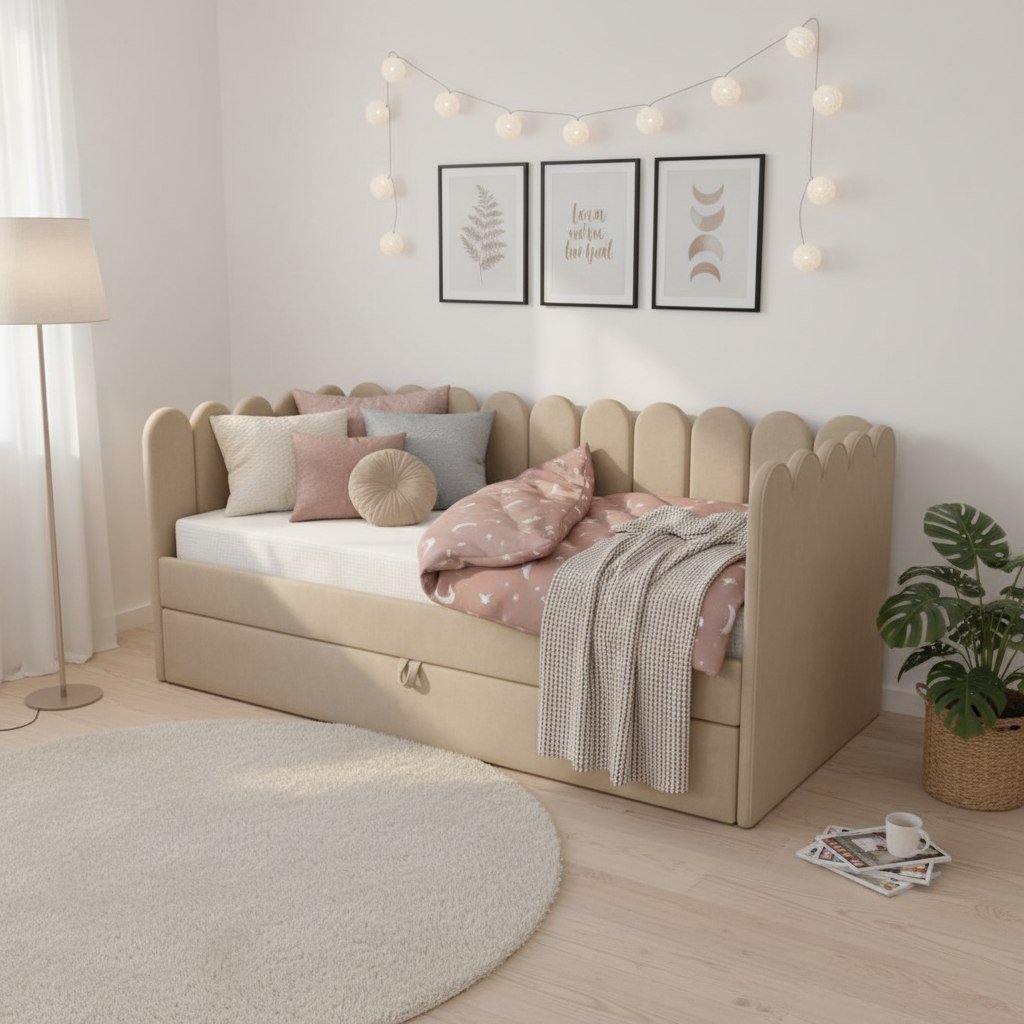 * Широкий выбор расцветок ткани для обивки кровати и размеров спальных мест.
