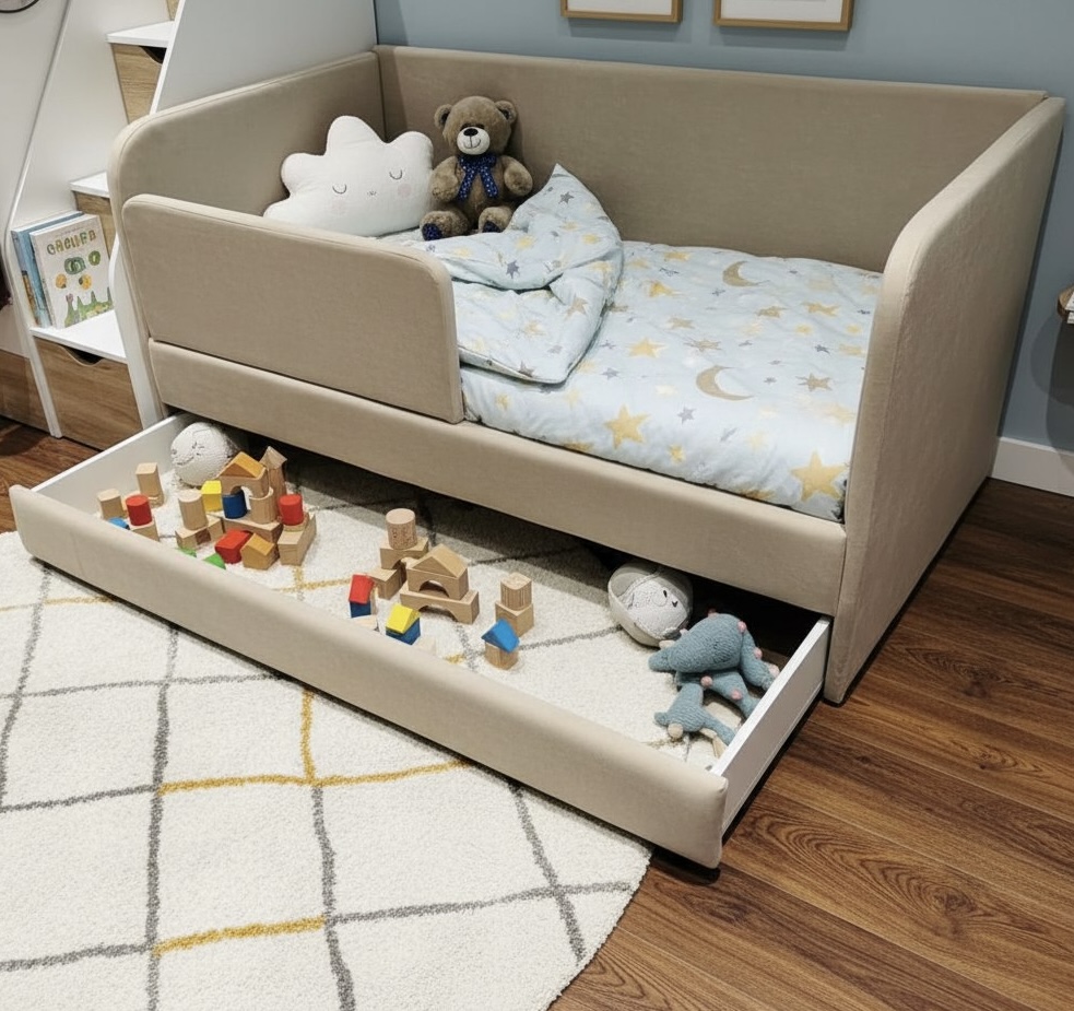 Кровать имеет съёмный универсальный бортик и выдвижной ящик (входят в стоимость кровати)