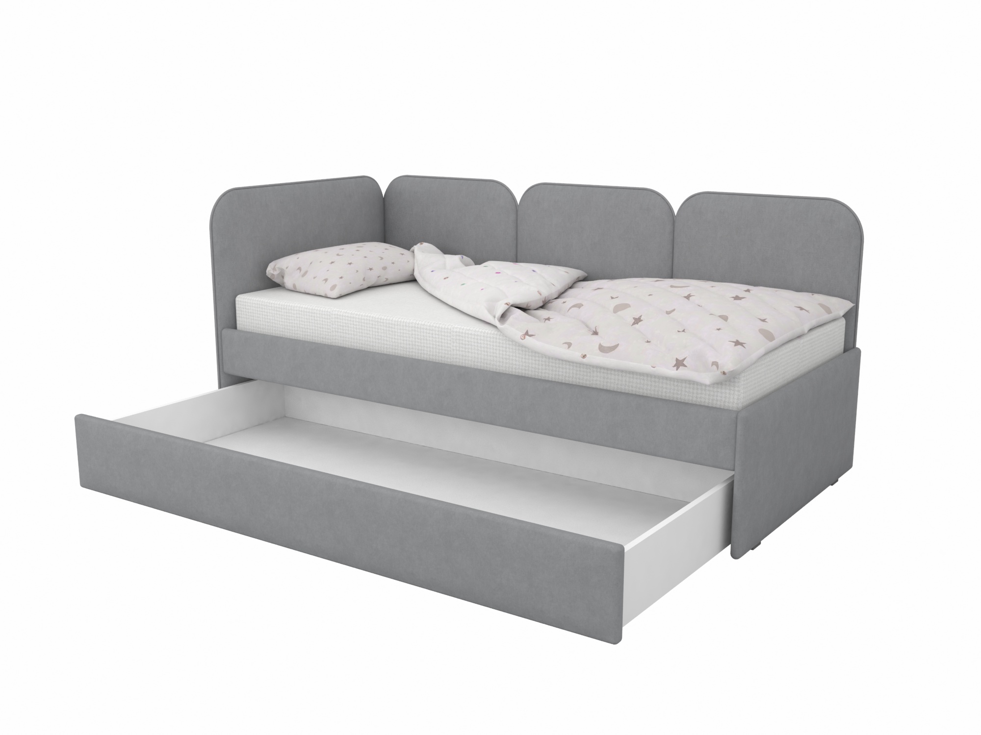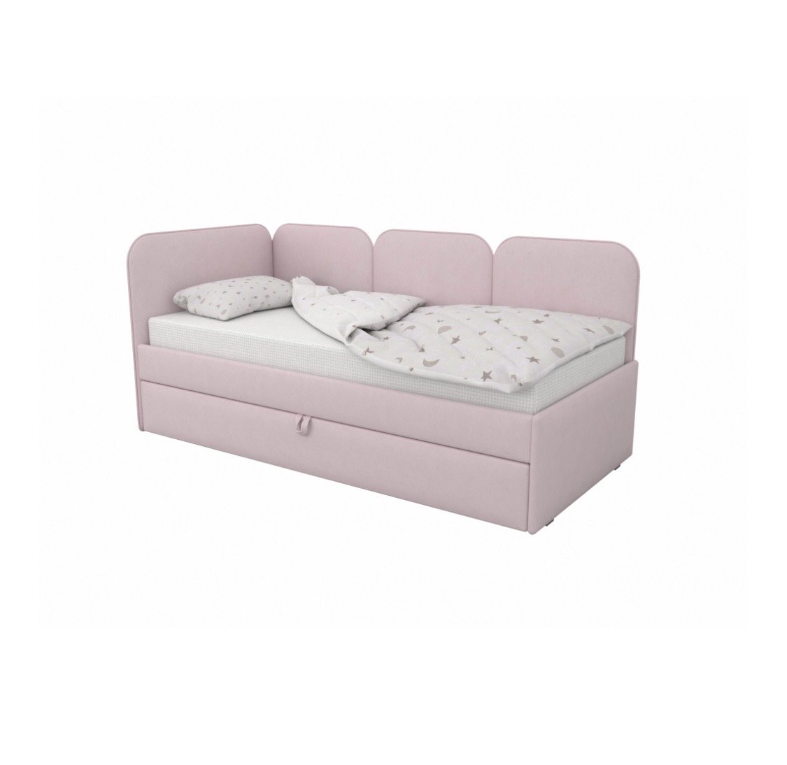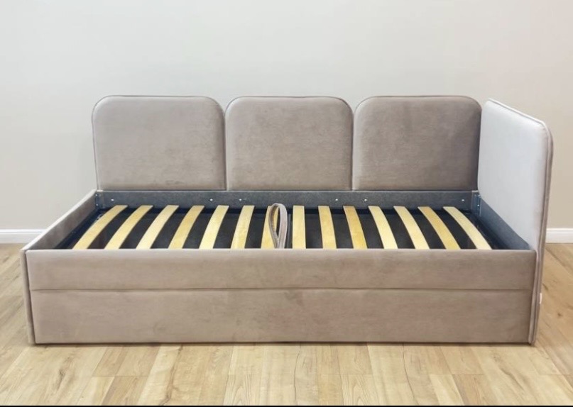 В комплект кровати входит выкатной ящик, который можно использовать как дополнительное спальное место или как ящик для хранения белья и игрушек.