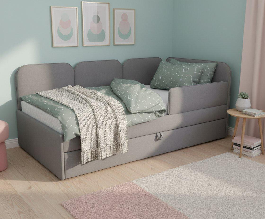 Мягкие панели, ящик для хранения, ортопедическое основание и возможность установить бортик для защиты от падения во время сна.