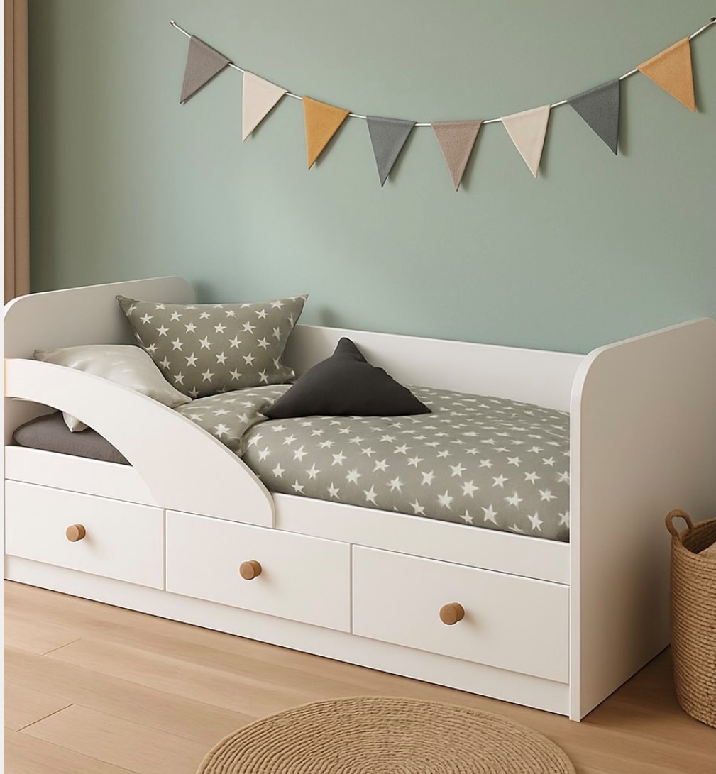 В кровать встроены три выдвижных ящика для белья и игрушек.