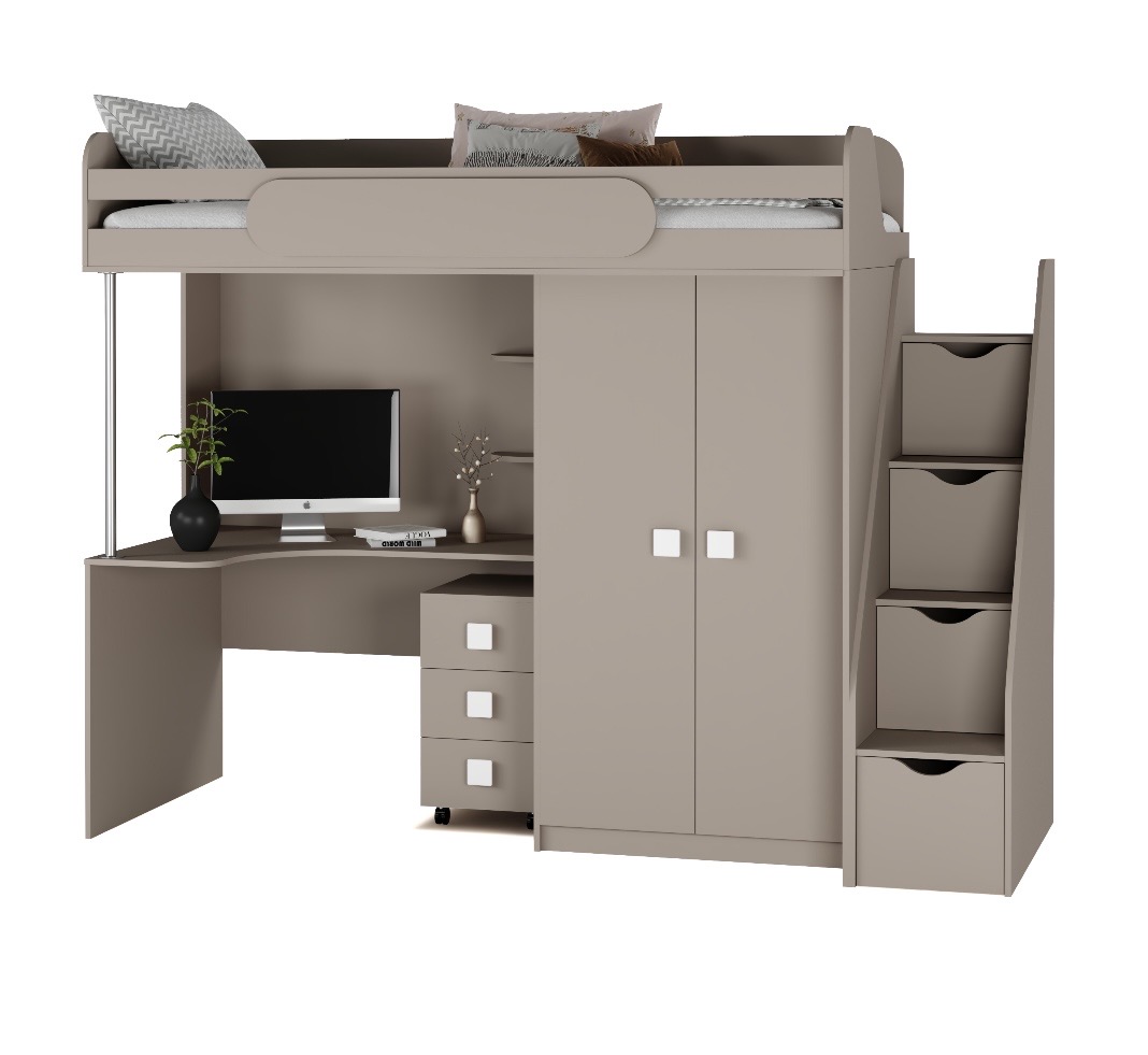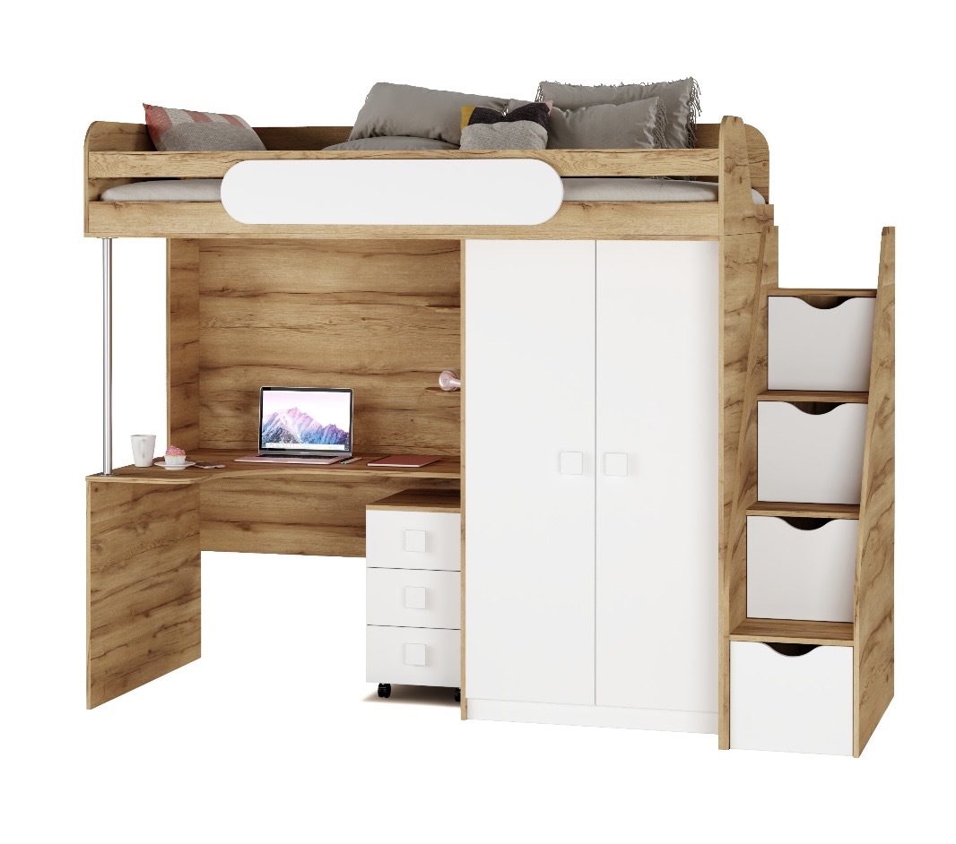 Кровать-чердак с рабочим пространством и шкафом – идеальное решение для детской комнаты.