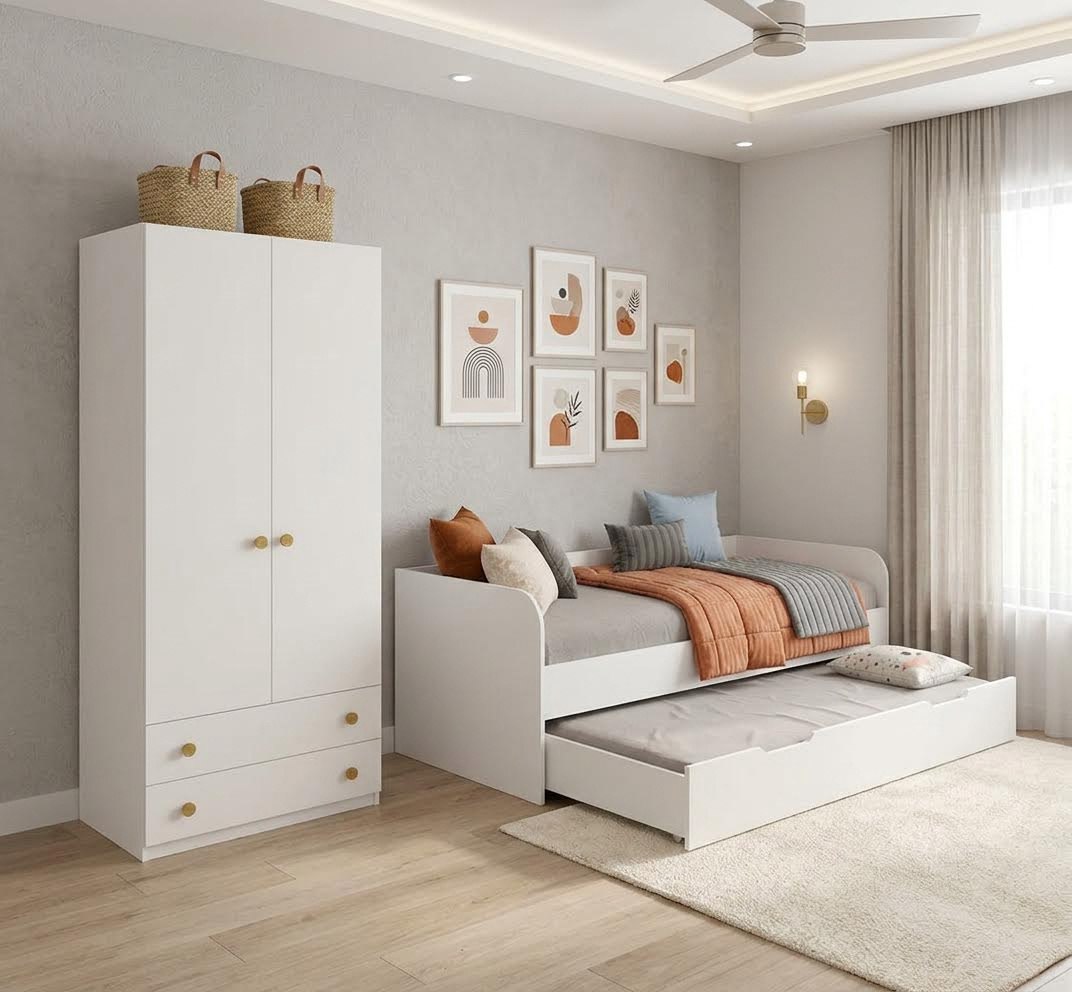 Нижняя кровать на выкатных роликах (при желании кровать можно выдвинуть полностью и поставить в другое место).