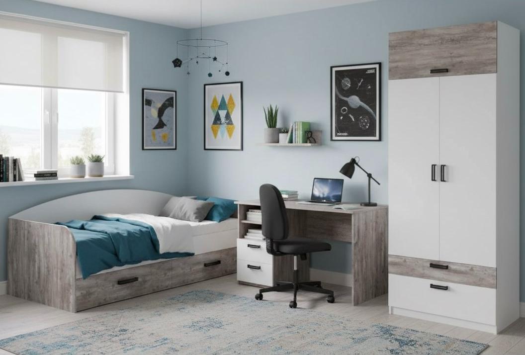 экологически чистого ЛДСП класса Е0,5 в сочетании цветов бетон пайн с белым.