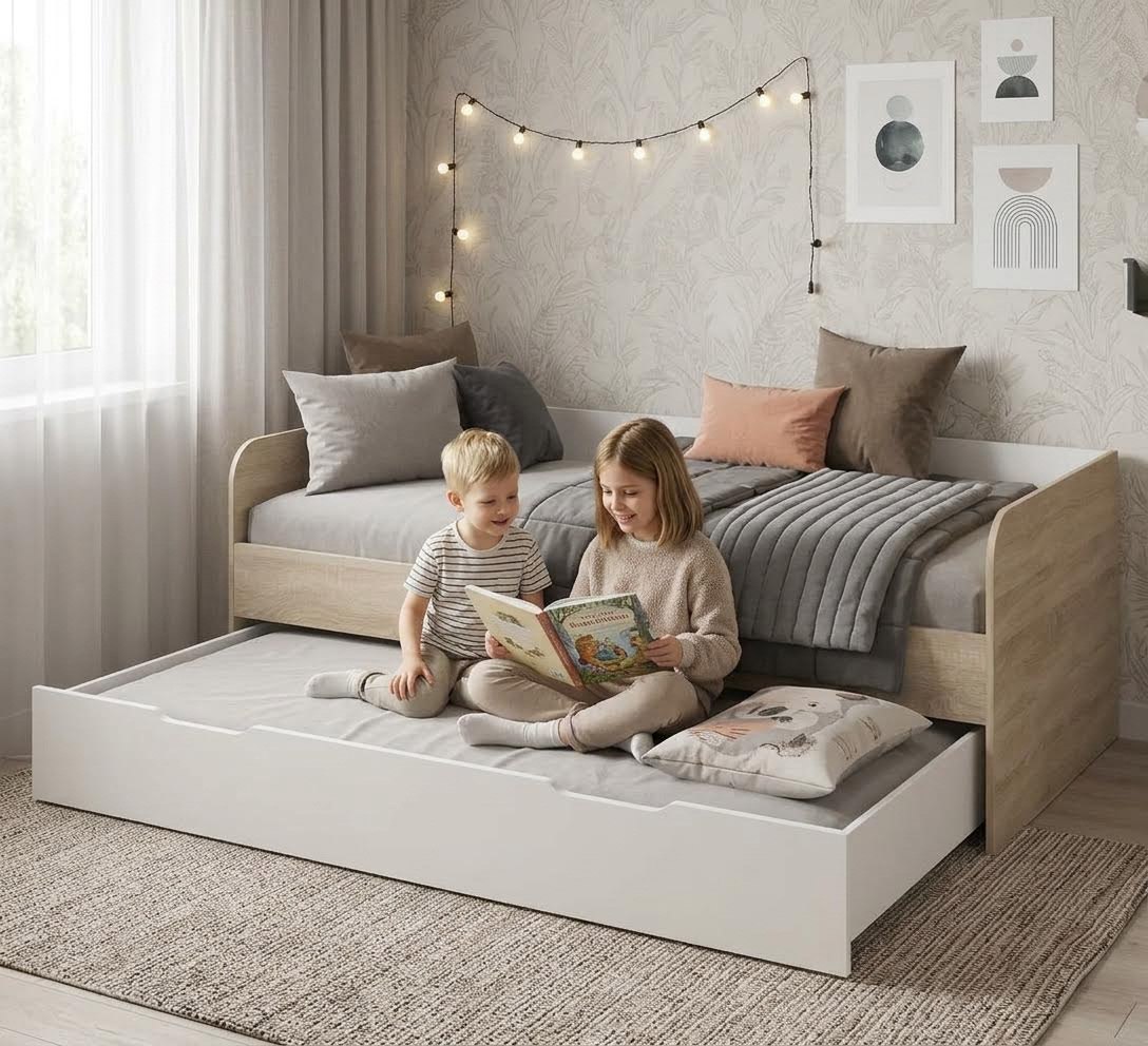 Экономия пространства: выдвижное спальное место легко убирается под основную кровать, освобождая место для игр и активного отдыха.