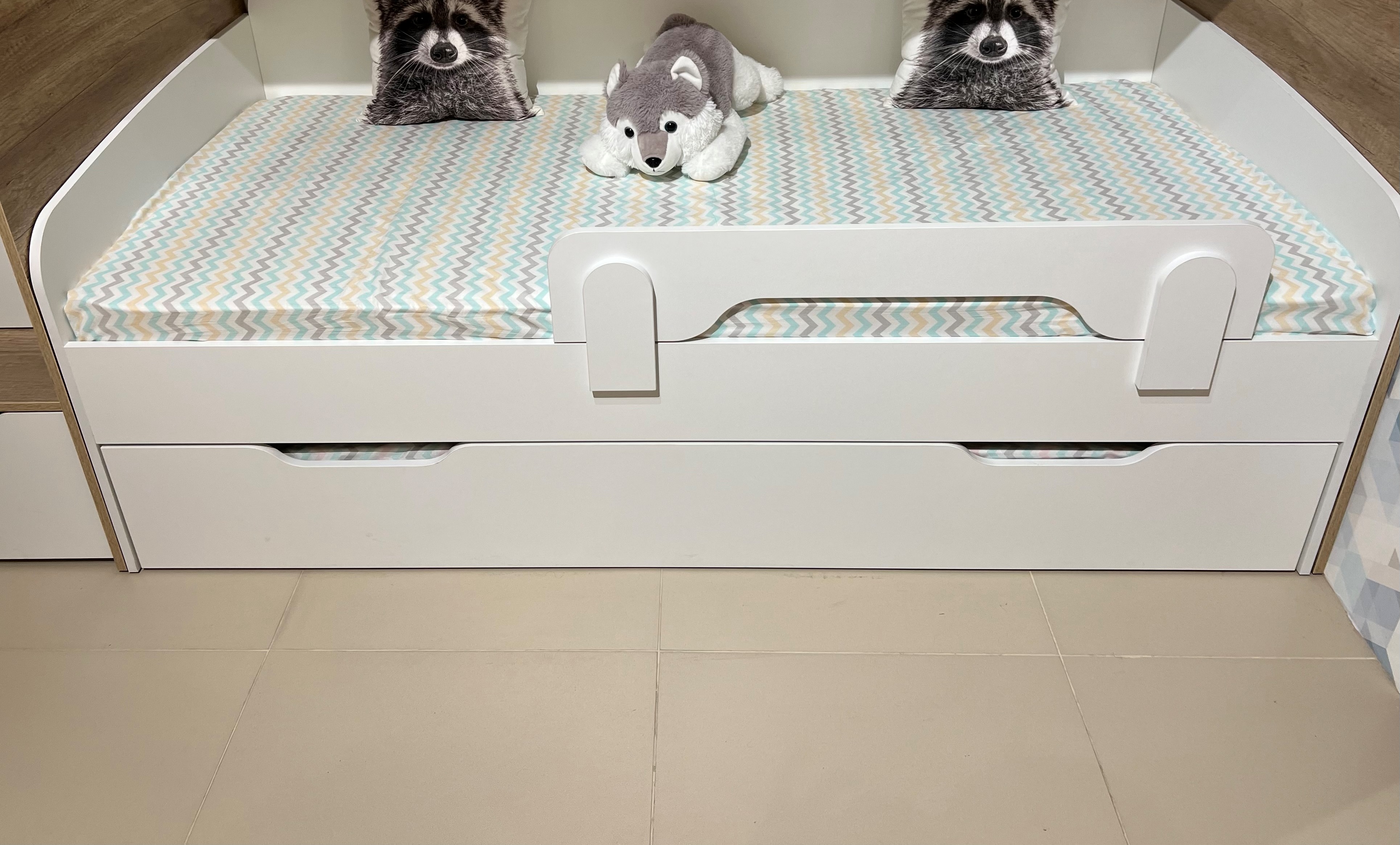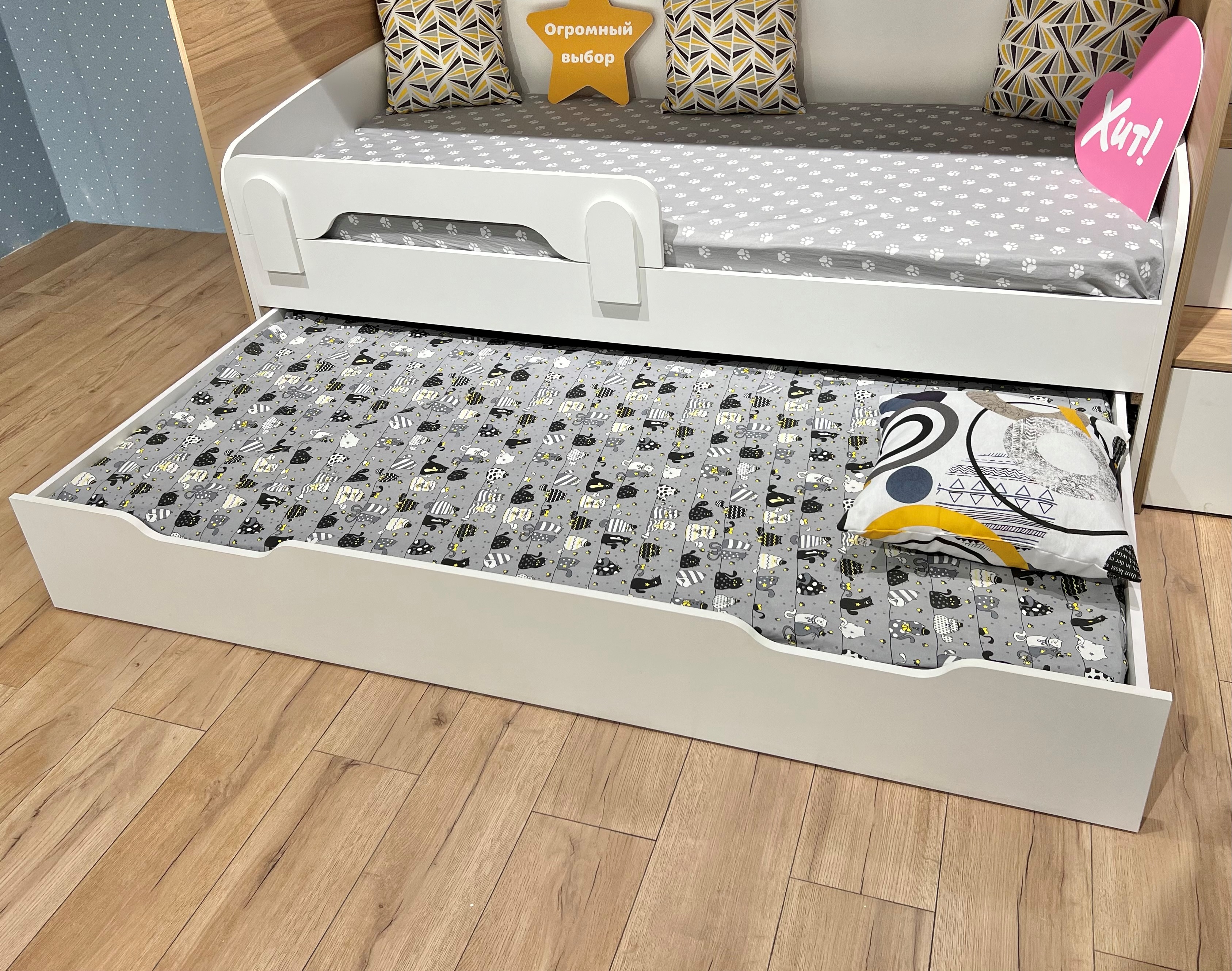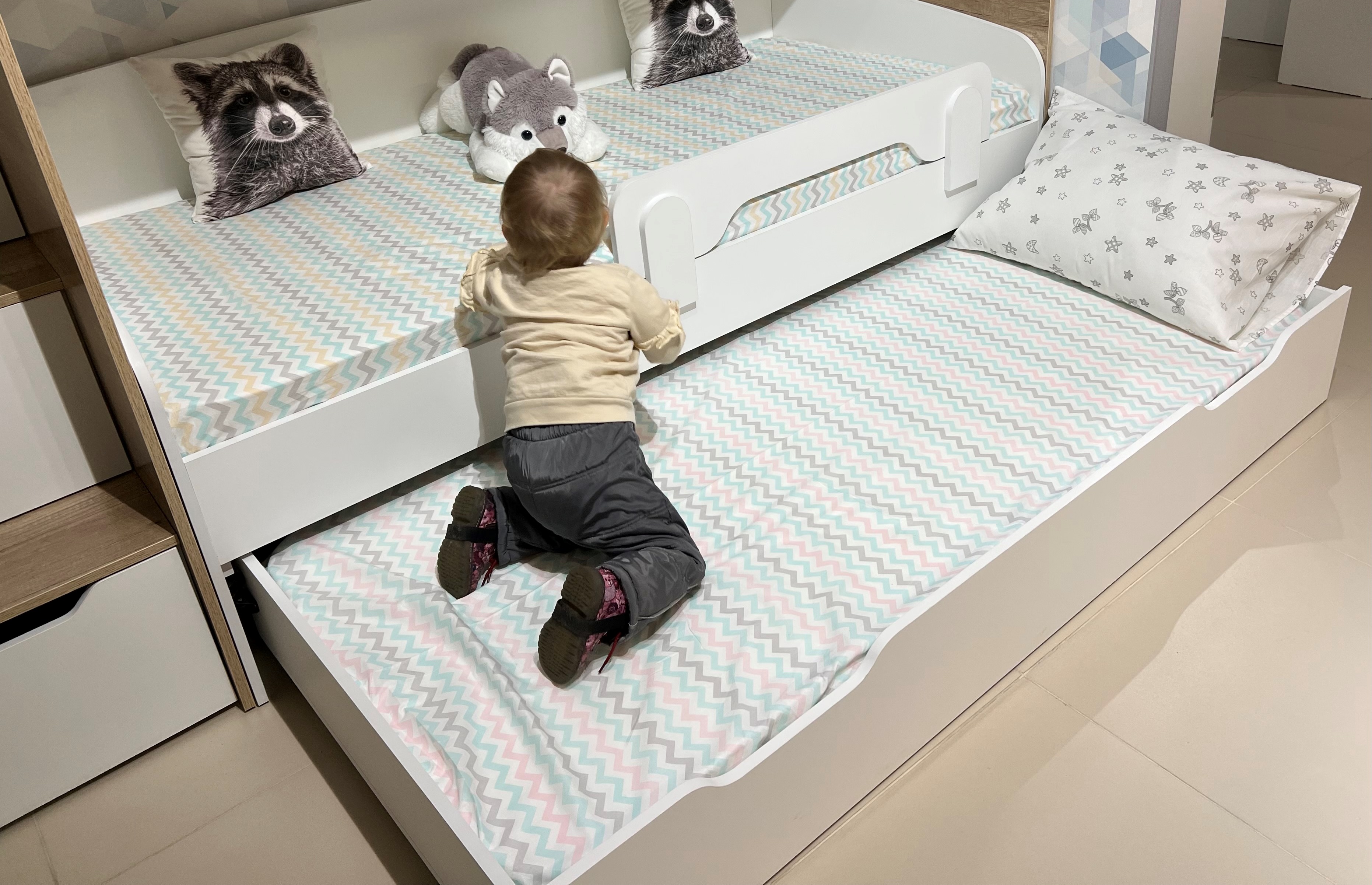 Экономия пространства :выдвижное спальное место легко убирается под основную кровать, освобождая место для игр и активного отдыха.