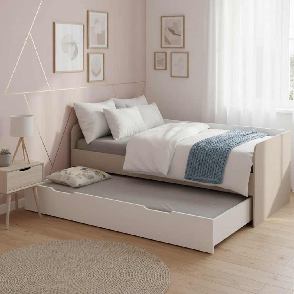 Экономия пространства: выдвижное спальное место легко убирается под основную кровать, освобождая место для игр и активного отдыха.