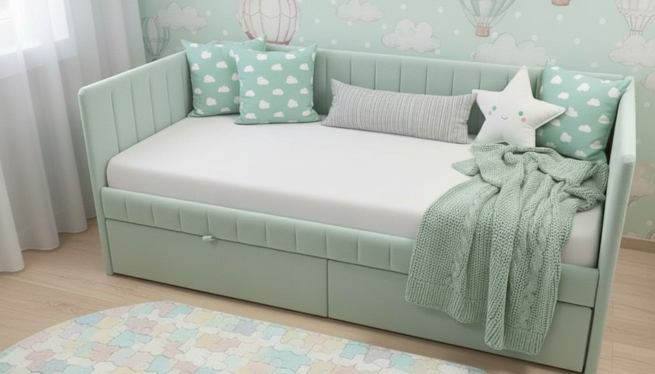 Кровать разработана с учетом требований к безопасности ребенка, сглаженные, мягкие углы, прочная конструкция и безопасные, гипоаллергенные материалы.