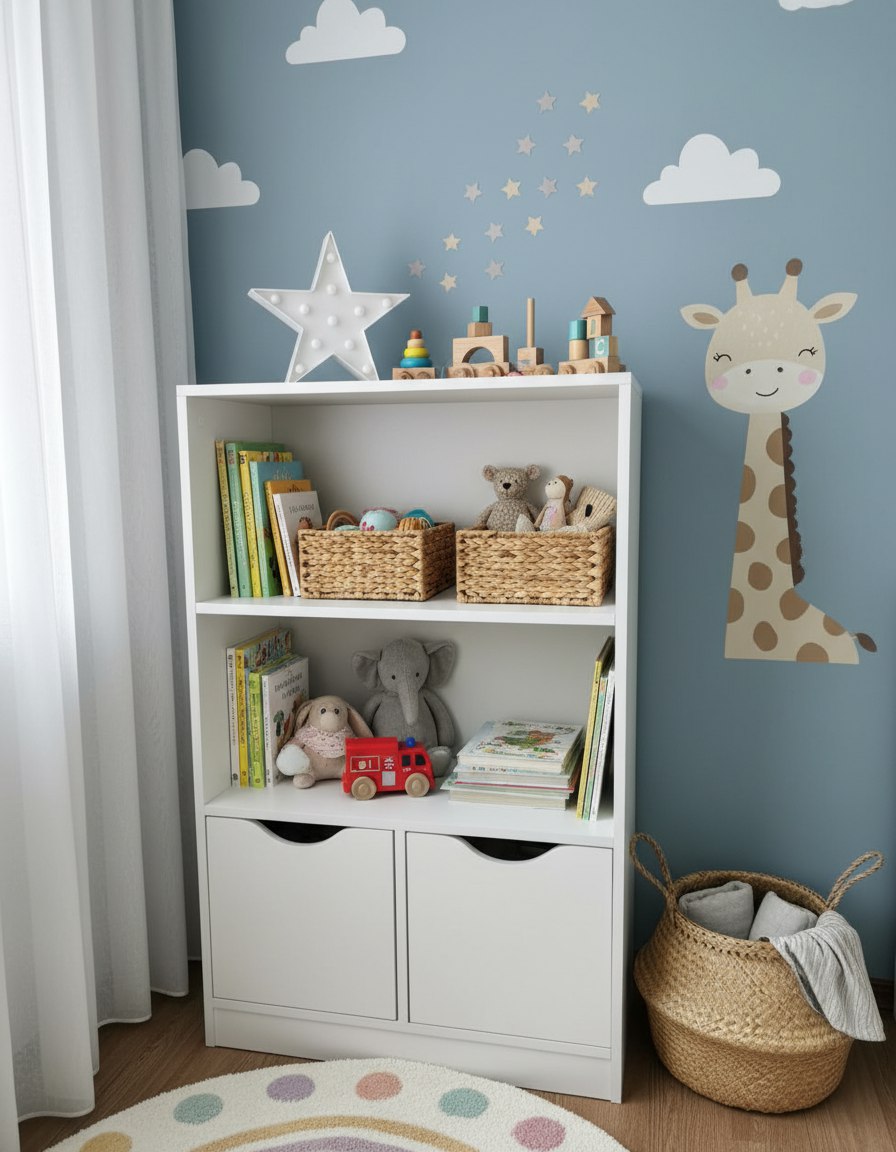 Ребенок с удовольствием разместит в таком стеллаже свои любимые игрушки и книги.
