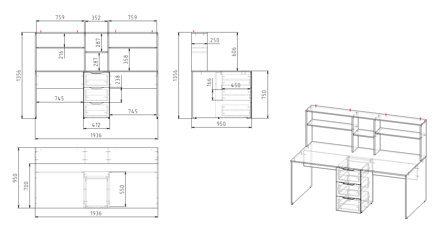 Габариты стола: ширина 1936, глубина 950, высота 1356 мм