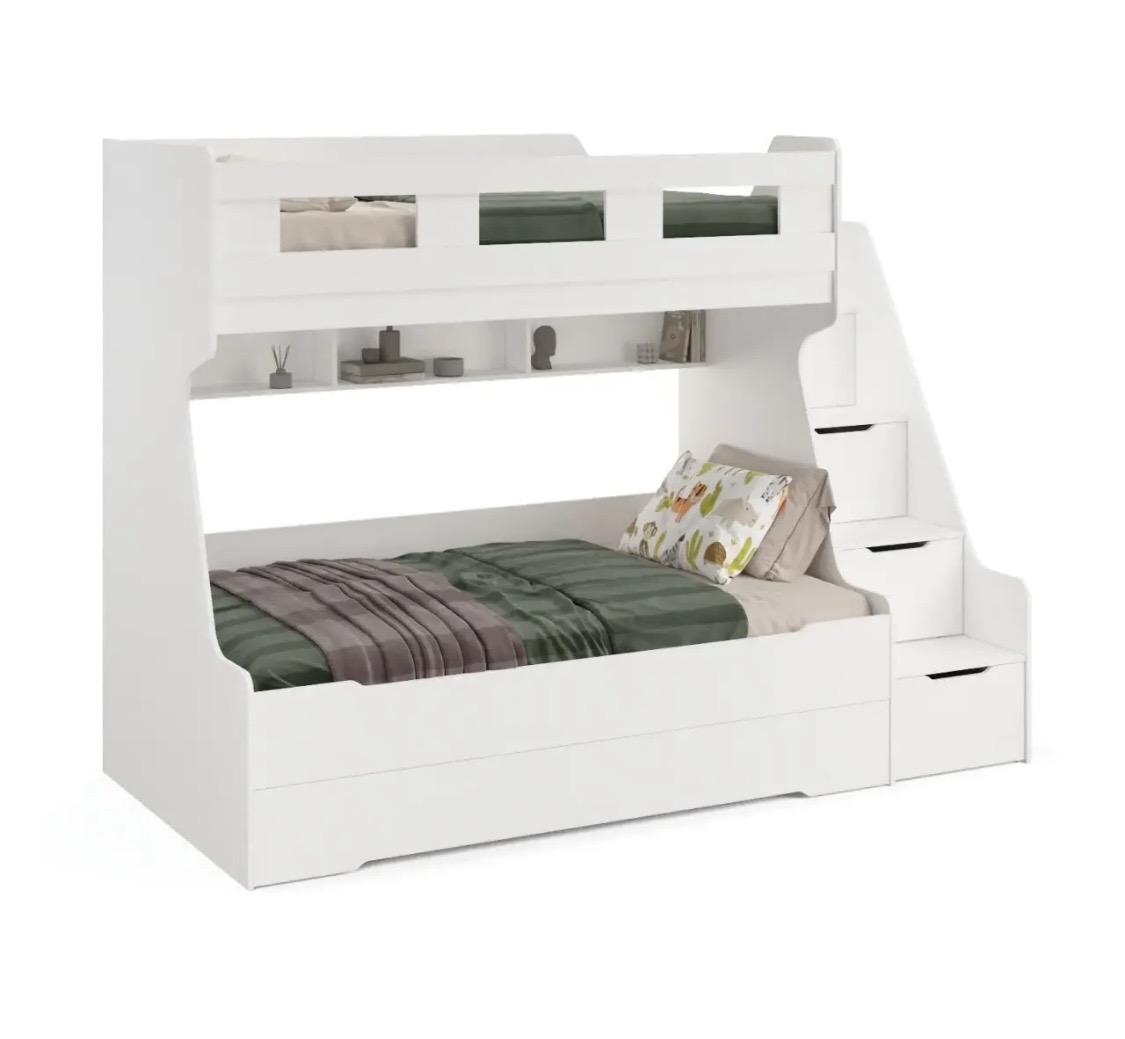 Высокая нагрузка на спальные места. Дополнительное выдвижное спальное место. Удобная лестница. Высокий, безопасный бортик |