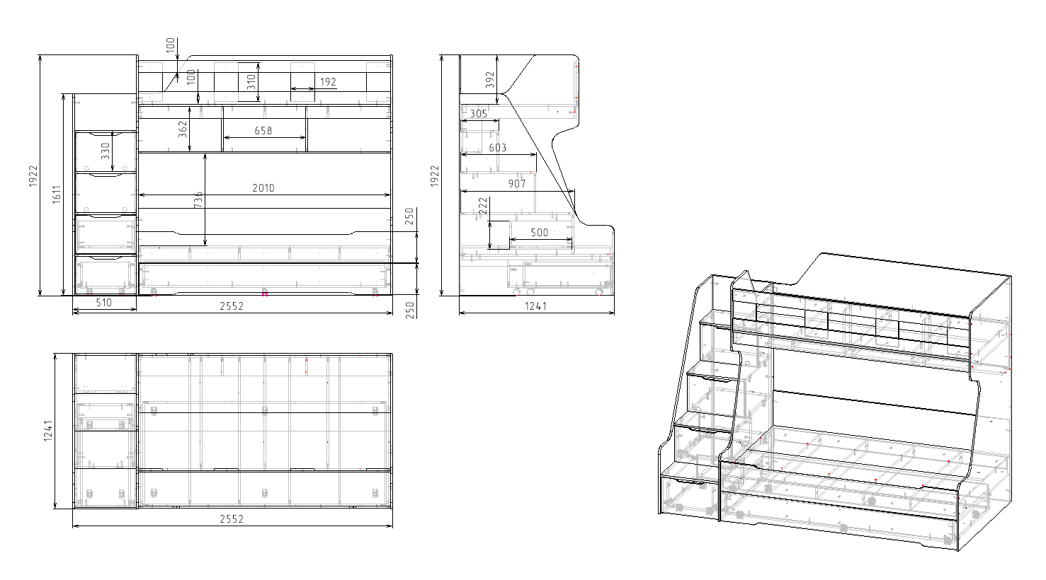 ширина 2552, высота 1922, глубина 1241 мм
